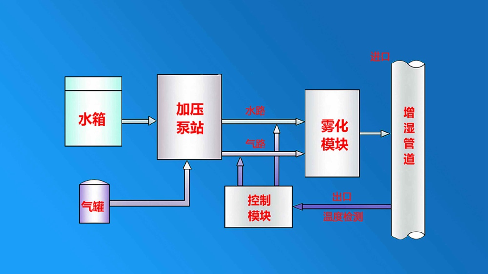 系統(tǒng)結(jié)構(gòu):該系統(tǒng)霧化噴槍固定在增濕塔錐體部位,整套設(shè)備由四部分構(gòu)成:一是壓縮空氣供應(yīng)系統(tǒng),與主排風(fēng)機(jī)相連接;二是加壓供水系統(tǒng)。由立式多級(jí)離心泵帶電機(jī)和整套精密低壓閥門、過濾器等附件組成;三是增濕塔頂部霧化系統(tǒng)。由增濕塔頂部環(huán)管、噴槍、噴嘴、高壓伸縮軟管及精密閥門、過濾器等連接件組成。四是多功能控制系統(tǒng)。由氣、水壓力、溫度、流量測控器,低壓元器件和變頻器等組成完整閉路控制系統(tǒng)。